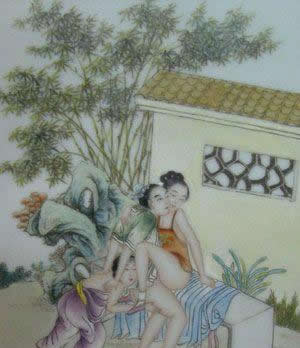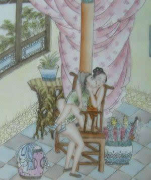 "素女"指房中术《素女经》。将春宫画与小姐观看的习惯,在中国古典文学中也有描写。唐代诗人白行简《天地阴阳交欢大乐赋》就说到《素女经》画册。清代李渔《肉蒲团》中的未央生,为了陶养一位如泥朔木雕、毫无生趣的绝色女子,"到书画铺买幅绝精绝巧的春宫册子,是本朝学士赵子昂的手笔,共有三十六套,唐诗上三十六宫都是春色的意思,拿去放在闺阁之中,好与玉香小姐共同翻阅。"可见在中国古代,春宫图的作用之一是作为进行性教育的媒介。除此以外,春宫图还作为"避火图"、"护书"和"嫁妆画"在民间大量流行。明、清两代,天津杨柳青等地的一些妇女每年春节前将春宫画当做年画销售,这就是有名的"女儿春"。